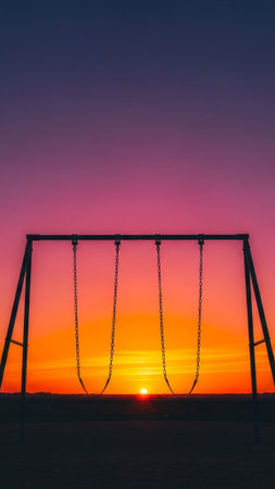 The silhouette of an empty swing set in a playground at sunset. The vibrant colors of the setting sun create a warm, orange and blue sky in the background. The scene has a nostalgic and slightly melancholic feel, representing childhood, memories, and the passage of time.