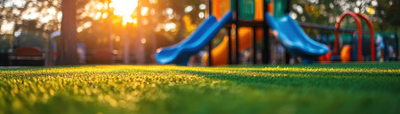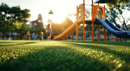 Children enjoy outdoor playtime at a vibrant playground during sunset, featuring colorful slides and well-maintained grass, creating a lively atmosphere for fun.