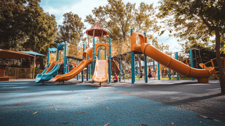 Young children enjoy a sunny day playing on vibrant playground equipment in a park with slides and climbing structures. Resplendent.