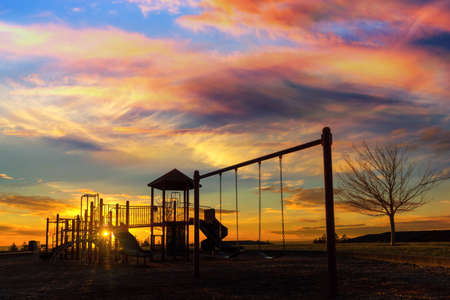 Colorful children playground in the park at sunset time with copy space