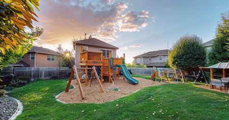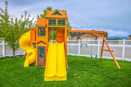 Panorama Whispy white clouds Small set of playground on a green lawn at the fenced backyard at Utah. There are swings and slide near the trees and white vinyl fence outside against the neighborhood houses at the background.