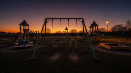A solitary teddy bear sits on a swing in an empty playground as the sun sets, casting long shadows and creating a melancholic atmosphere