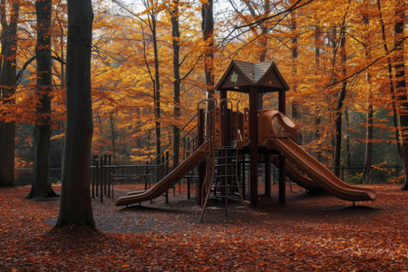 A group of children enjoy playing on a slide in a play area surrounded by trees in the woods, A playground surrounded by the autumn-colored forest, AI Generated