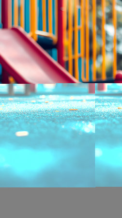 Brightly colored slides in a playground, bathed in sunlight. Concept of childhood joy, playground structures, and summer days.