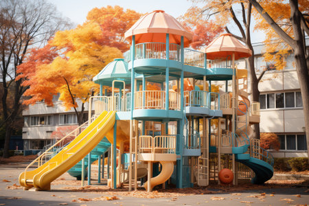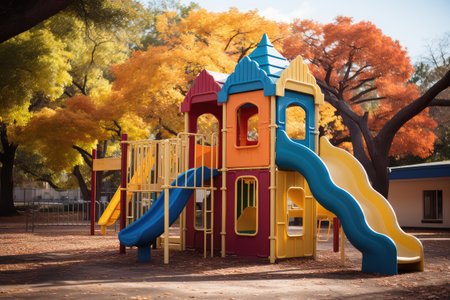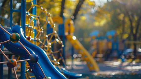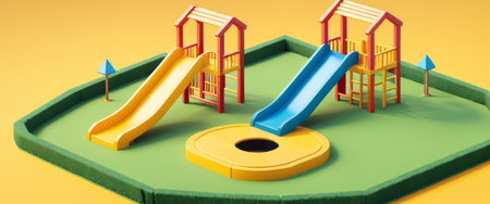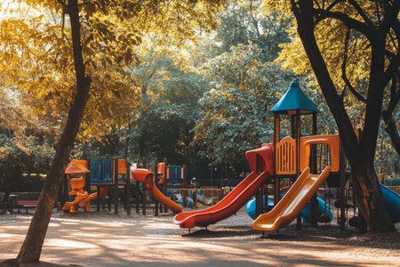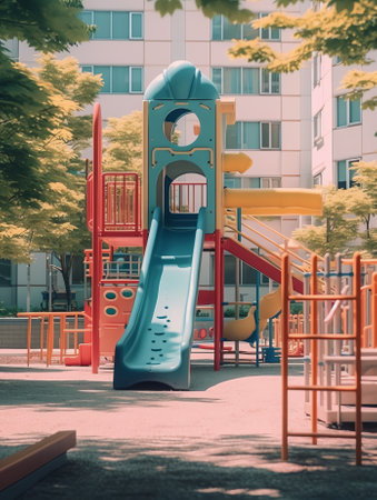 Sunlit children's playground with vibrant slides. Concept of recreational spaces, child's play, and outdoor activities.