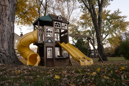 Small kids playground in the backyard during autumn time