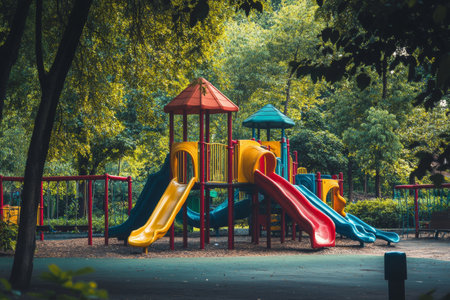 Vibrant urban playground exciting slides and climbing structures amidst lush summer trees