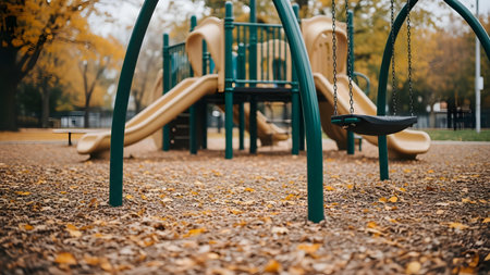 A low-angle shot of a playground swing and slide set surrounded by fallen autumn leaves. The scene is slightly melancholic and empty, with the focus on the swing seat and the ground covered in brown foliage.