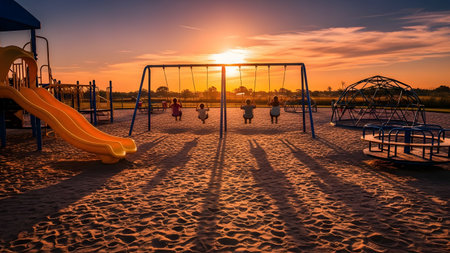 A wide shot of a playground at sunset, featuring children on swings in silhouette against a warm orange sky. The scene captures the joy of childhood play and the peaceful end of a day at the park.