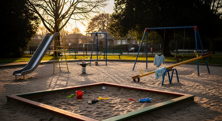 An empty children's playground features a sandpit, seesaw, and swing set bathed in the warm light of sunrise or sunset. Long shadows stretch across the sand, creating a nostalgic and quiet atmosphere.
