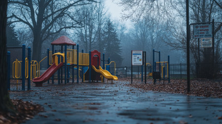 Misty, empty playground on a gloomy day symbolizing isolation and societal impact of viral outbreaks or quarantine