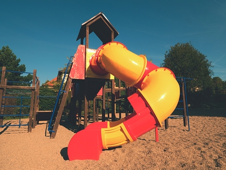 Playground colorful tube slide in public park. New plastic slider tube and wooden ladders
