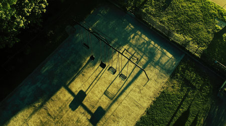 An aerial view captures an empty playground with swings casting long shadows, evoking feelings of nostalgia and tranquility in the golden hour light.