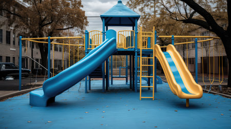 Children playing on a playground with a blue slide and a red and blue slide, enjoying their time outdoors, An ethereal playground in a soft-lighted bokeh background, AI Generated