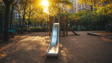 A serene playground scene features a shiny slide glistening in the golden sunset, framed by lush trees and a peaceful urban park atmosphere, inviting joy and exploration.