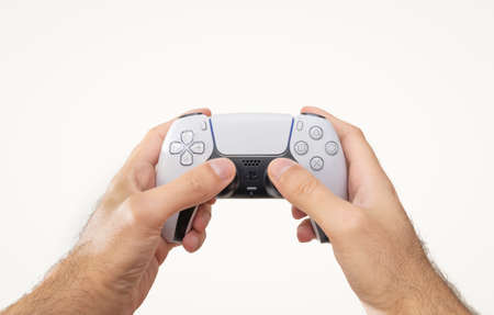Minsk, Belarus - March 2, 2019: Playstation 5 joystick in hands. High quality photo