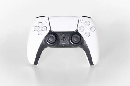 Budva, Montenegro - March 16, 2021: New product from Sony, wireless white Play Station 5 gamepad on blue background.