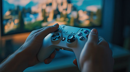 Close-up of a persons hands holding a wireless video game controller, with the console and monitor slightly blurred in the background.