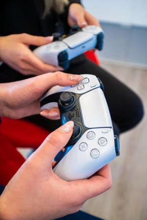 Uzhhorod. Ukraine September 16, 2021. Girls play PlayStation 5 close-up at home. Gaming Wireless Gamepad.