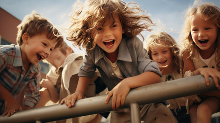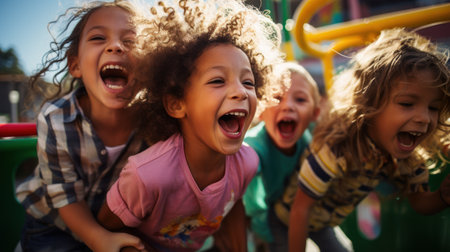 Children playing on a playground with excited expressions. Kids spending time outdoor together. Generative AI
