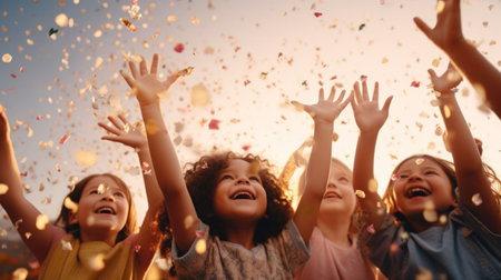 Group of Kids blowing confetti and soap bubble with sunset vibe background.