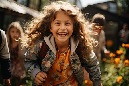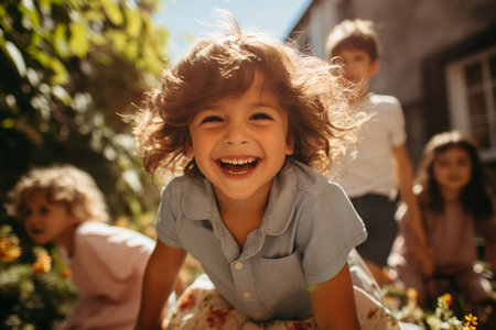 Happy children running outside in a lush garden. Their joyful expressions and energetic movements reflect the pure joy of childhood playtime in a sunny environment.