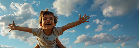 Happy little boy Happy little boy keeping arms raised and smiling while jumping : Generative AI