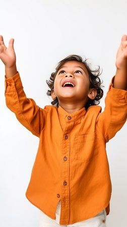 A cheerful young child with curly hair raises their hands excitedly while smiling brightly. The child is dressed casually in a colorful setting.