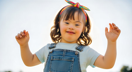 Child with Down syndrome is happily playing outside in denim overalls and a vibrant headband, enjoying a sunny day, embodying joy and social interaction