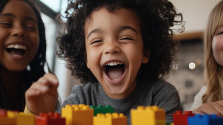 Three children are engaged in playful activity, building with colorful blocks while laughing. Their joyful expressions capture a moment of happiness during the afternoon.