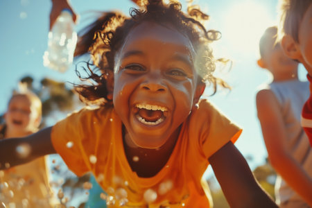 Joyful children celebrating summer with colorful confetti in a vibrant street festival.