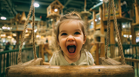 A joyful child swings energetically, expressing pure happiness in a lively indoor playground filled with unique play structures. The playful environment exudes vibrancy and fun.