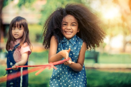 Happy children playing tug of war and having fun during summer camping in the park. Children recreation concept.