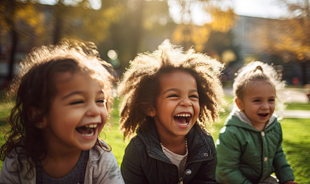 Radiant children playing with contagious joy in a sunny park., generative AI