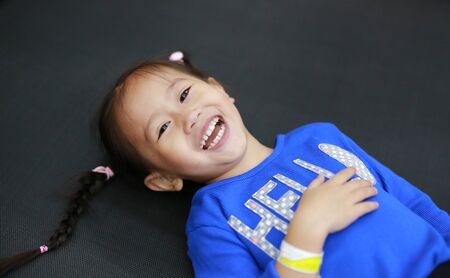 kid asian girl's lie leisurely on the Lawn floor and smile looking at