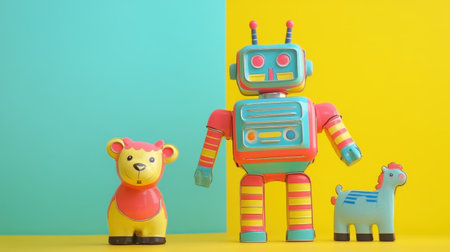 A joyful arrangement of colorful toy figures in a precise lineup, each representing individuality yet united in purpose, ideal for conveying themes of diversity and unity, banner