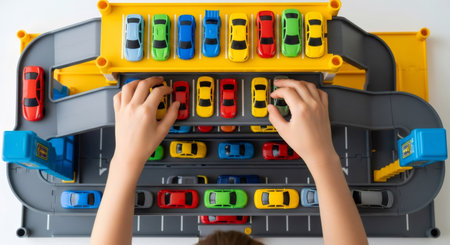 Child playing with toy car parking garage. Kid hands arranging colorful miniature vehicles on multistory toy. Fun game.