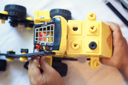 Child playing with toy truck. Close up of kid assembling construction plastic truck.