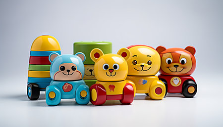 A delightful collection of colorful baby toys displayed on a wooden surface, creating a playful atmosphere with a charming bokeh background. Ideal for family-themed projects.