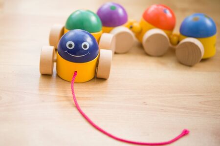 A childs colourful wooden toy caterpillar on a wooden floor