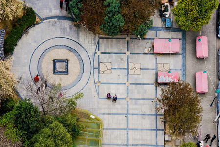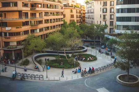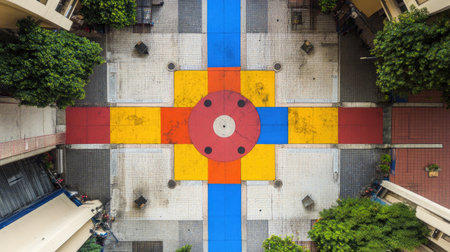 This aerial image captures a vibrant urban plaza with colorful geometric patterns. Surrounded by lush greenery, it creates a lively atmosphere for community engagement and creativity.