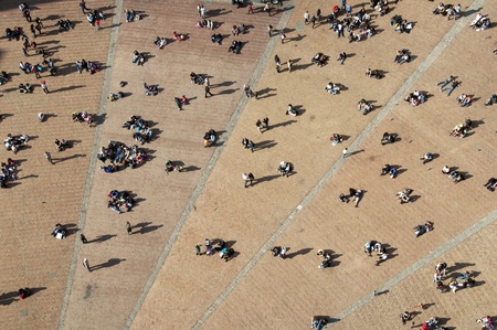 SIENA, ITALY, MARCH 19, 2017 - Tourists and locals relax, lying down in Piazza del Campo, the main and famous square of Siena.