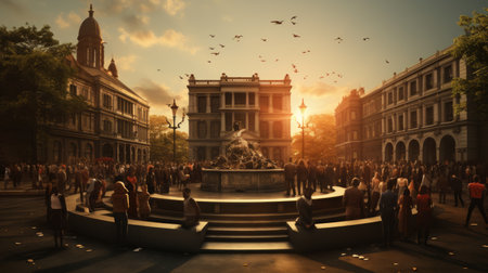 A city square scene during sunset featuring historic architecture, pedestrians, and modern skyscrapers in the background