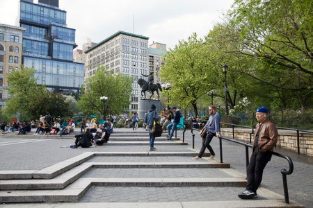 NEW YORK, NEW YORK/USA - May 7, 2018: People lounge on the steps of Union Square and East 14th street in Manhattan.