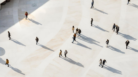 Top view of social distance of blur people are walking in public space on concrete pavement landscape. Concept in aerial view of man and woman family in social life.