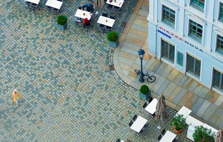 DRESDEN, GERMANY - SEPTEMBER 22, 2014: Top down view on street of Dresden, state of Saxony, Germany, Europe. Restaurant and people down below.