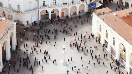 A high-angle view of a busy pedestrian street in an urban environment, featuring people walking, shopping, and interacting in a modern cityscape.