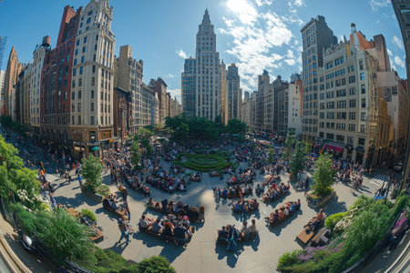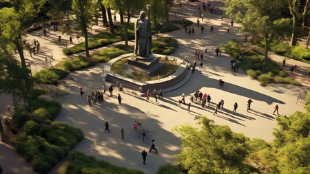 This aerial photograph captures a vibrant urban plaza filled with people walking among lush trees under bright sunlight, highlighting community activity.
