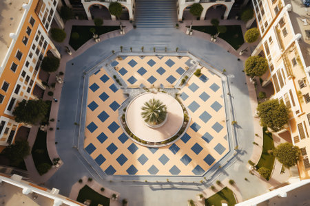 top view of a roundabout in the middle of a busy city. aerial view centered symmetrical.