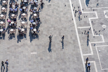Milan, Italy, September 9, 2018: Crowd of small figures of many people are walking and a lot of pigeons on Piazza del Duomo square in historical city centre, top view from the roof of Milano cathedral
